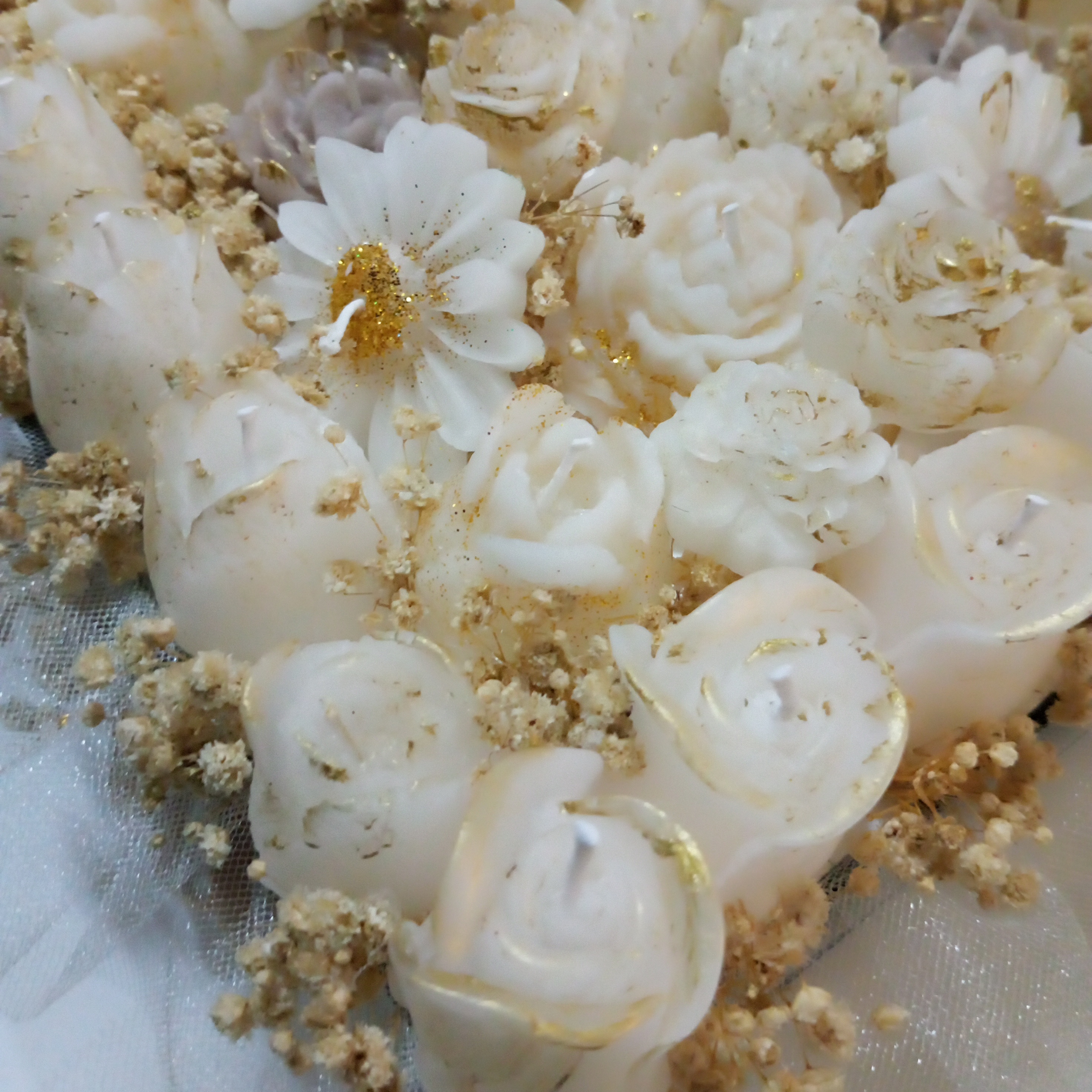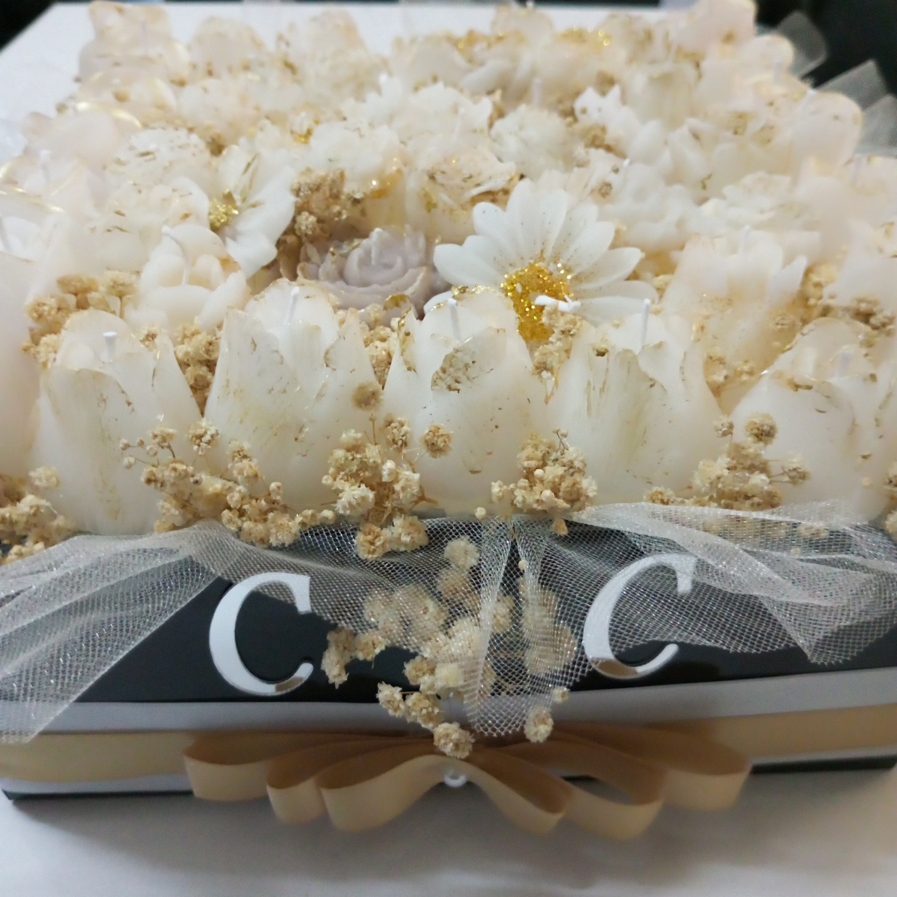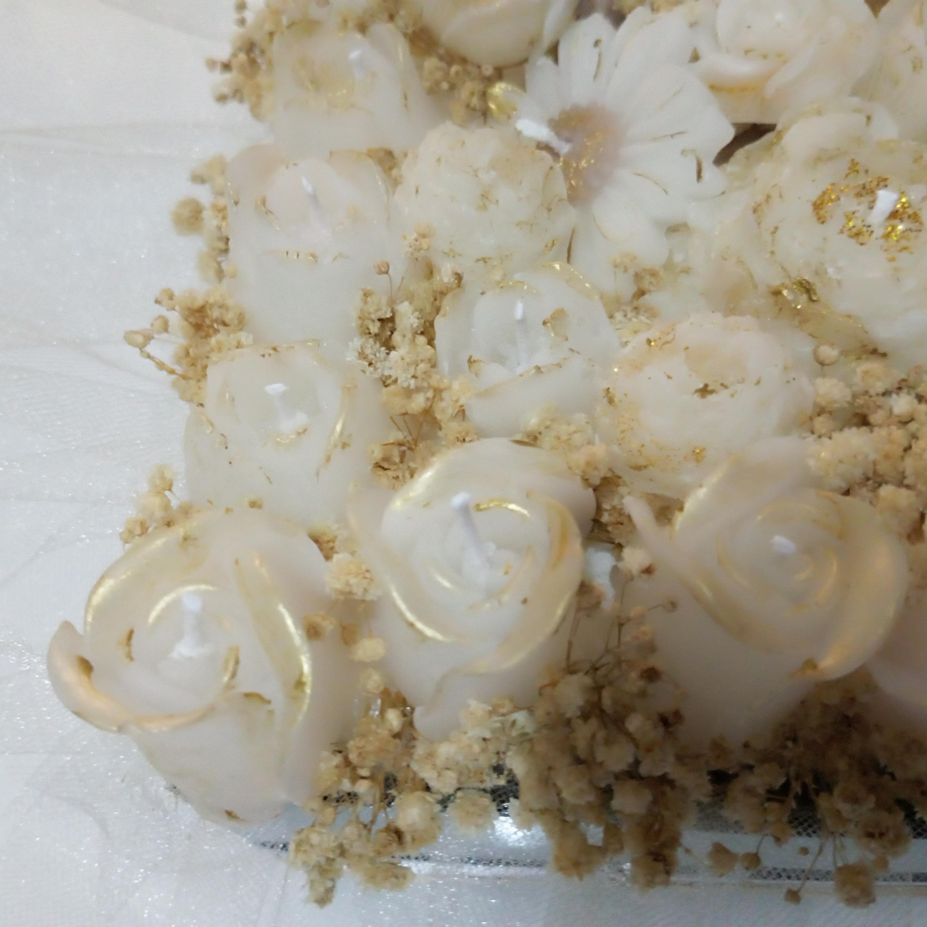Beyaz - Gold Renkli İsteme Çiçeği Mum Tasarım Buket