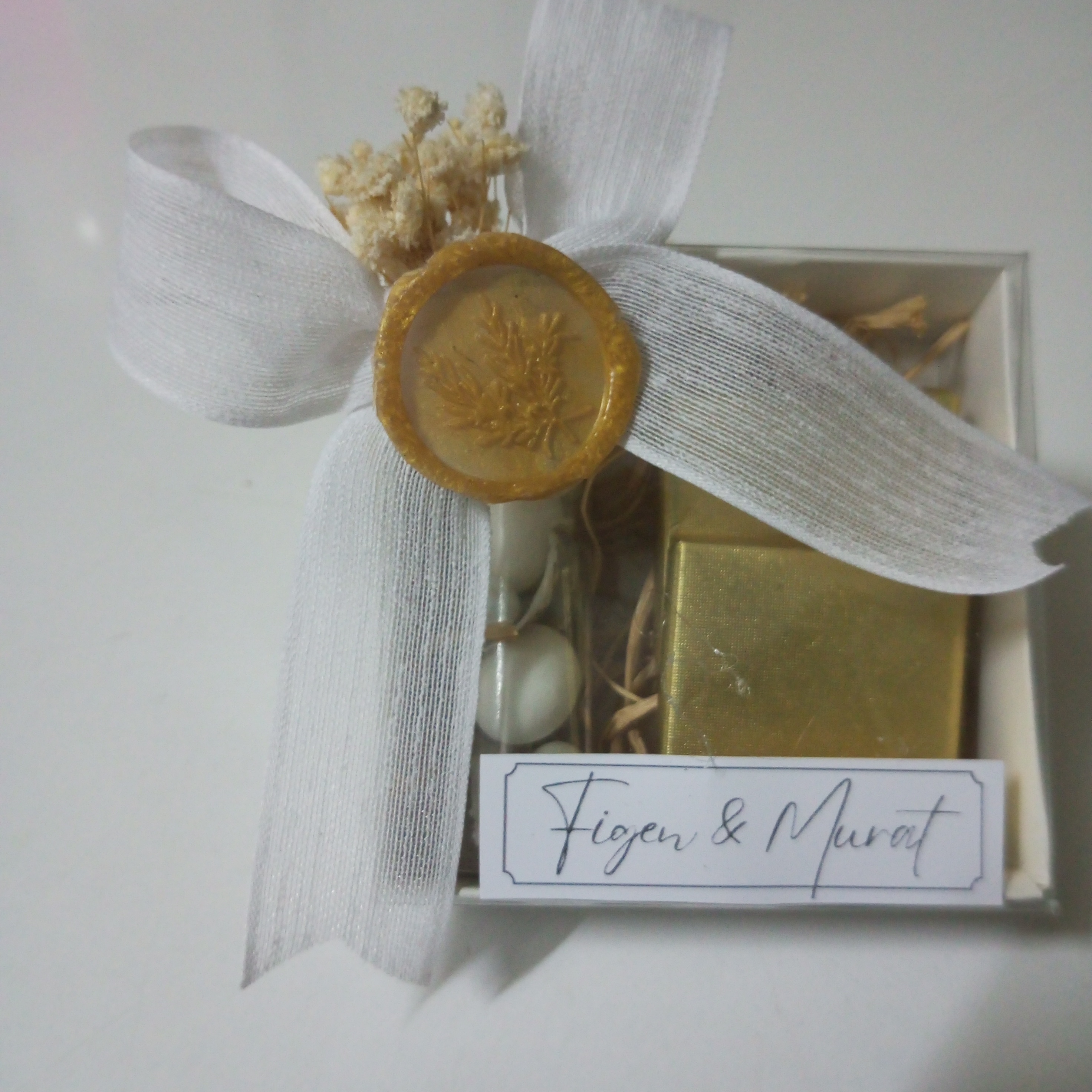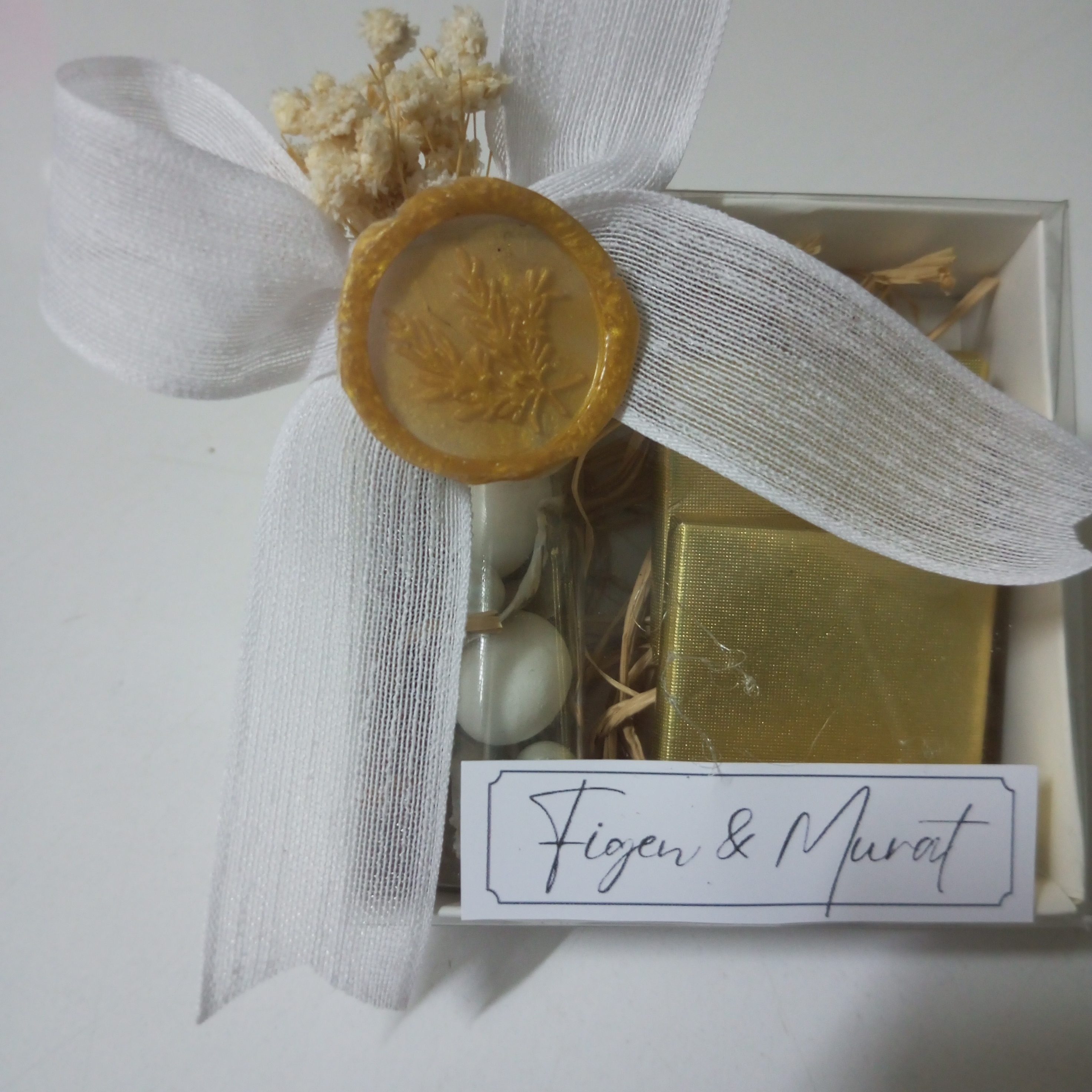 Bu benzersiz tasarıma sahip hediyelik kutular, yalnızca misafirlerinize sunulan bir ikramdan öte, özel anılarınızı ve sevginizi simgelemektedir. Düğün veya nişan gününüzde konuklarınızın yüzünde bir gülümseme yaratmak için mükemmel bir tercih. Gold mühür ile süslenmiş her kutu, zarif bir sunum yaparak etkinliğinize ayrı bir makam katmaktadır. Üründe isim etiketi bulunmaktadır.