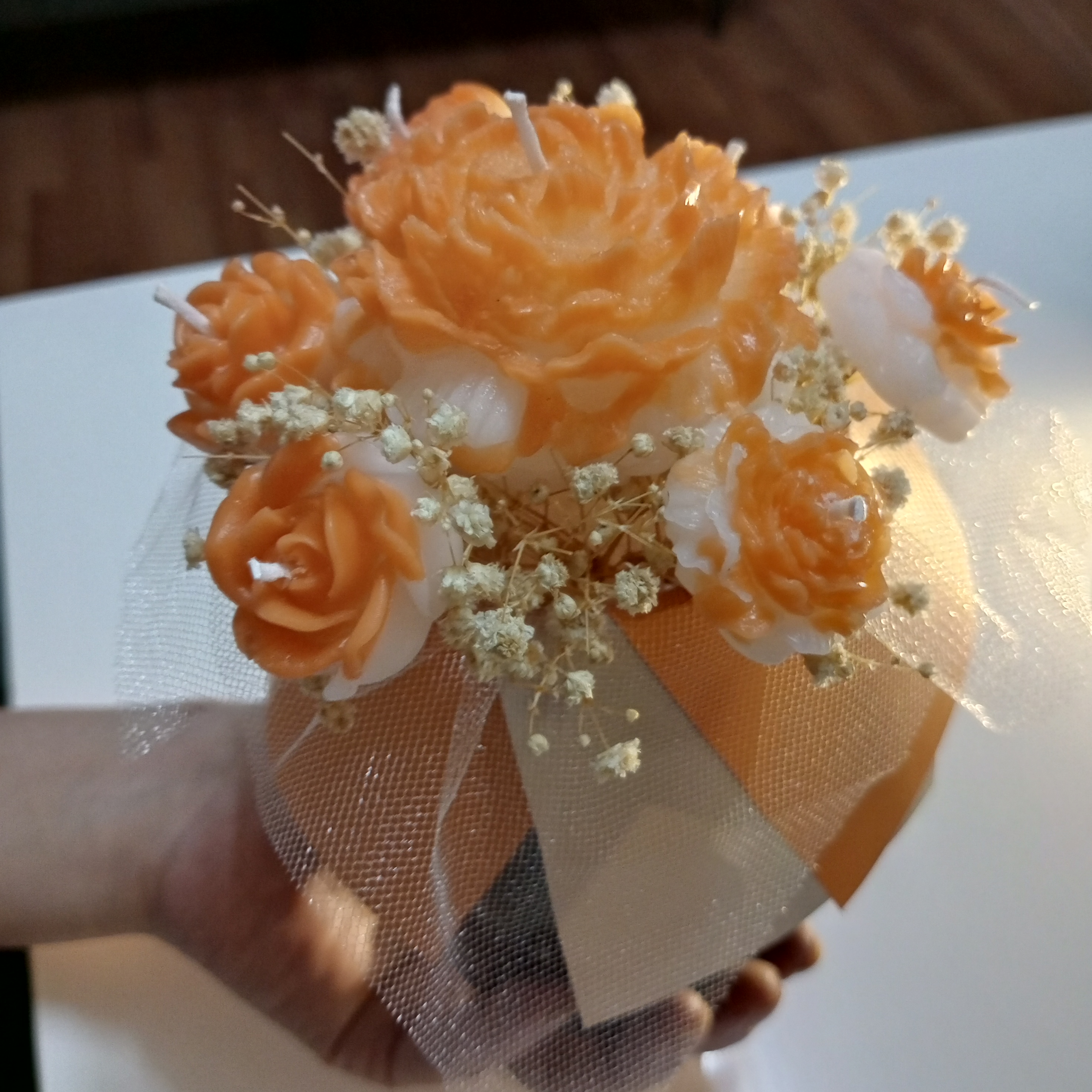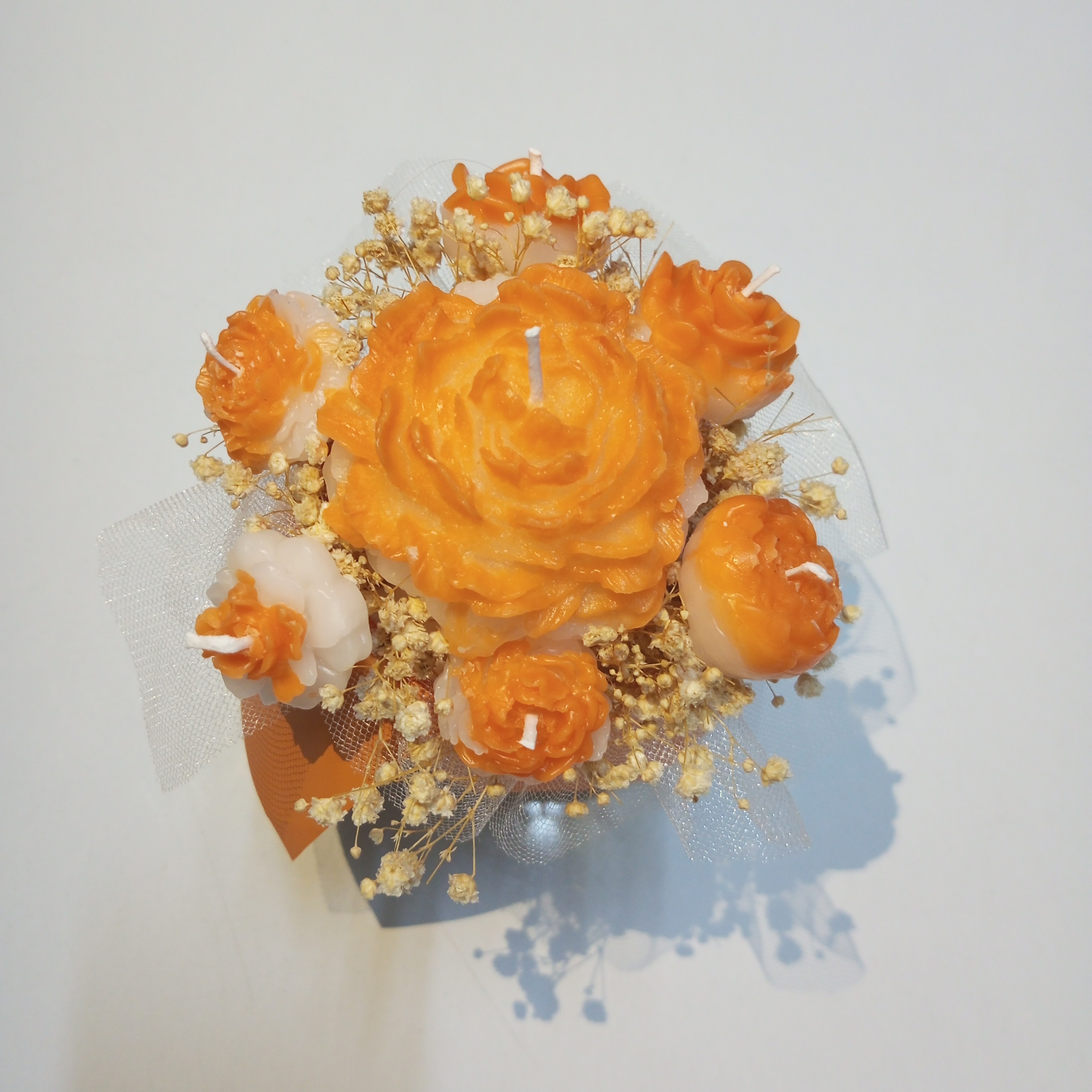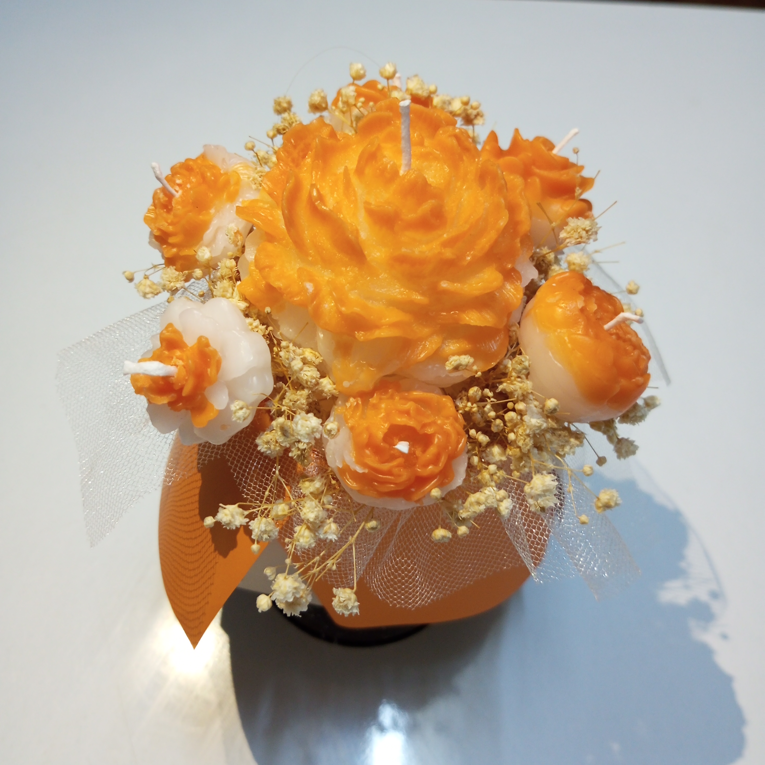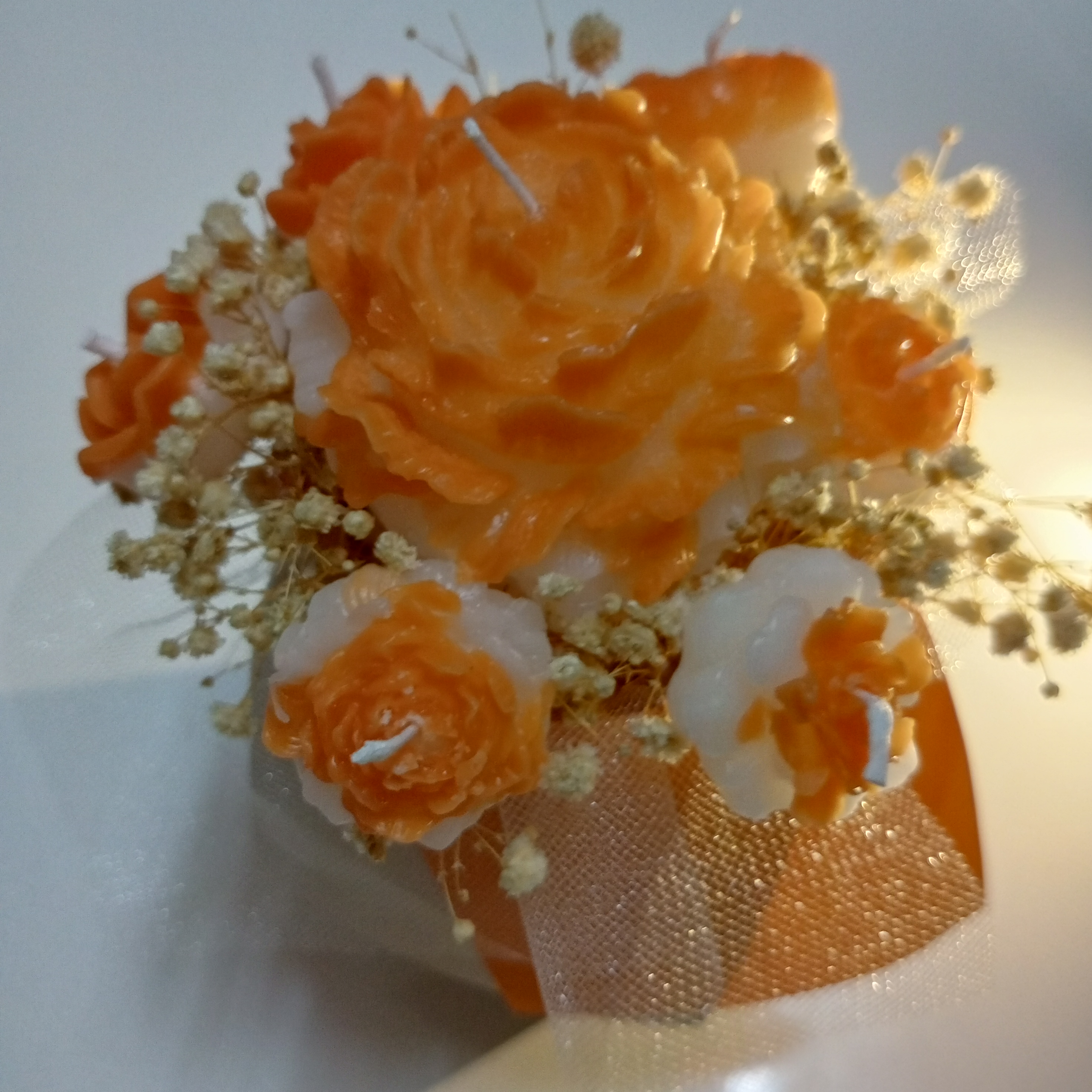 Ürünümüz özel kutusu içinde, büyük şakayık mum, mini güller ve cipso çiçeklerinden oluşmaktadır. İstenirse kişiye özel not yazılmaktadır.