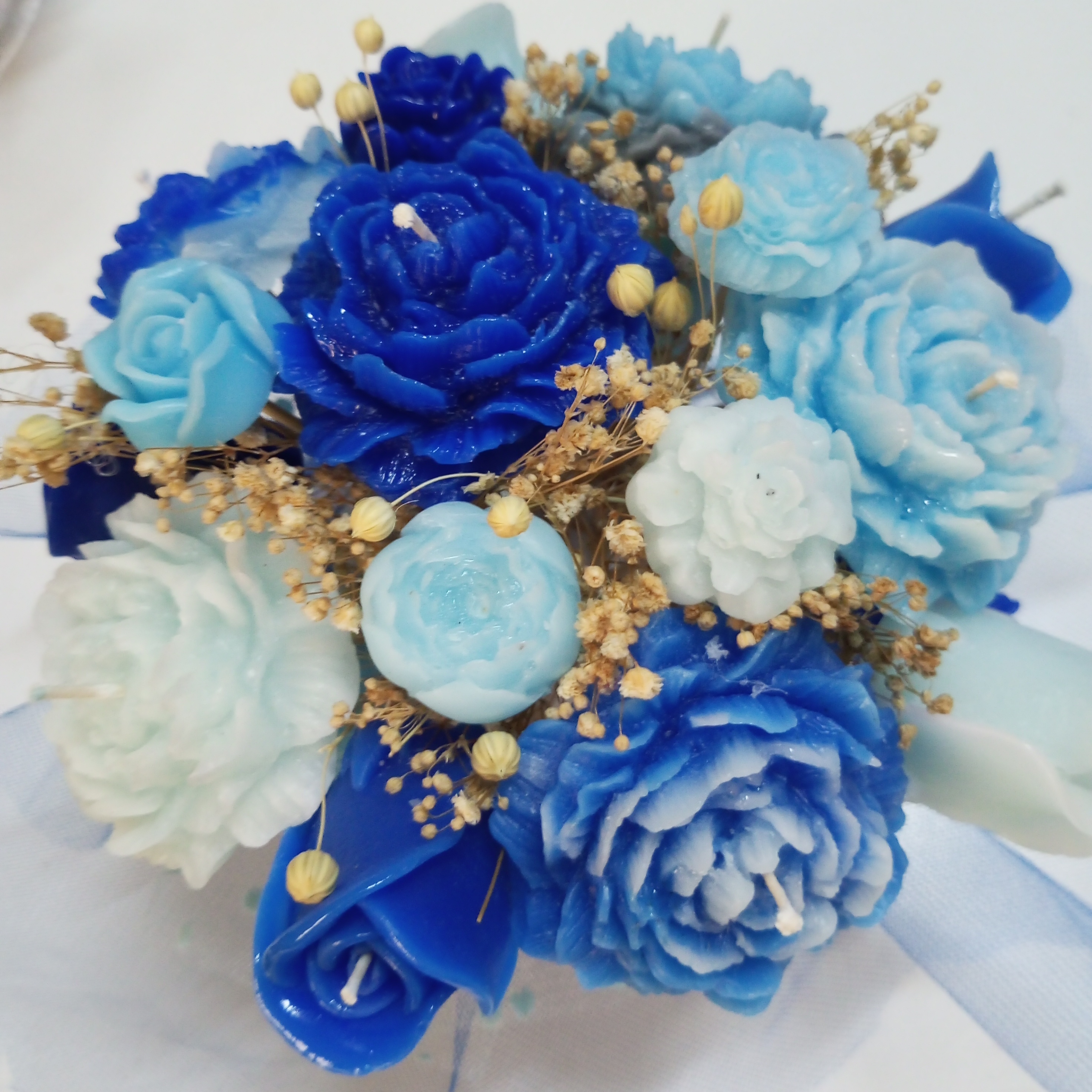 Mavi Şakayık Gül Mum Çiçek Buketi, zarafeti, canlı renkleri ve sıcak atmosferi ile hayallerinizdeki çiçek aranjmanını bir araya getiriyor. Doğal malzemelerle özenle hazırlanmış bu buket, hem görsel estetik hem de zarafetiyle mekanlarınıza farklı bir hava katacak. Ev dekorasyonunuza şıklık katmanın yanı sıra, özel günlerde sevdiklerinize hediye edebileceğiniz harika bir seçenek sunmaktadır.