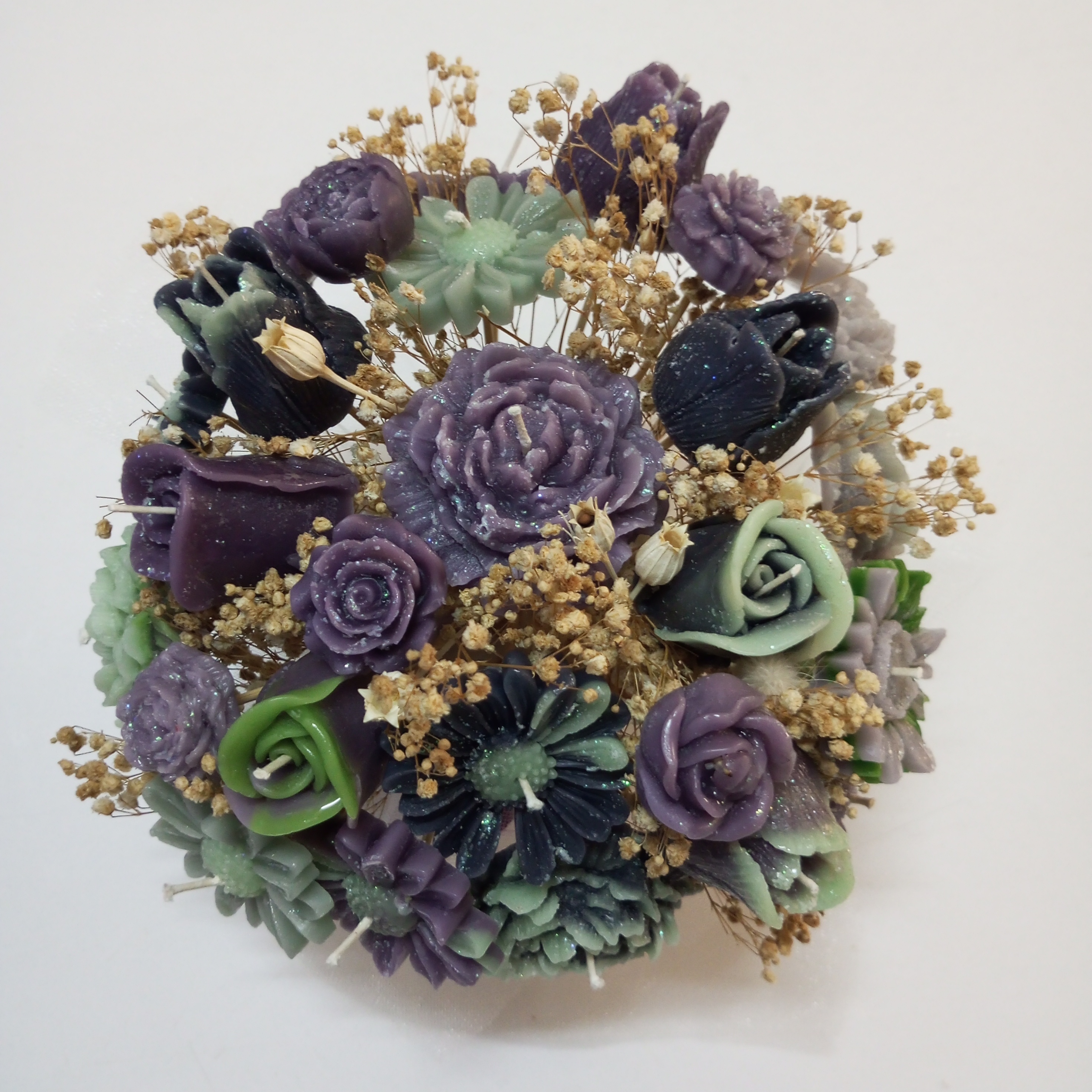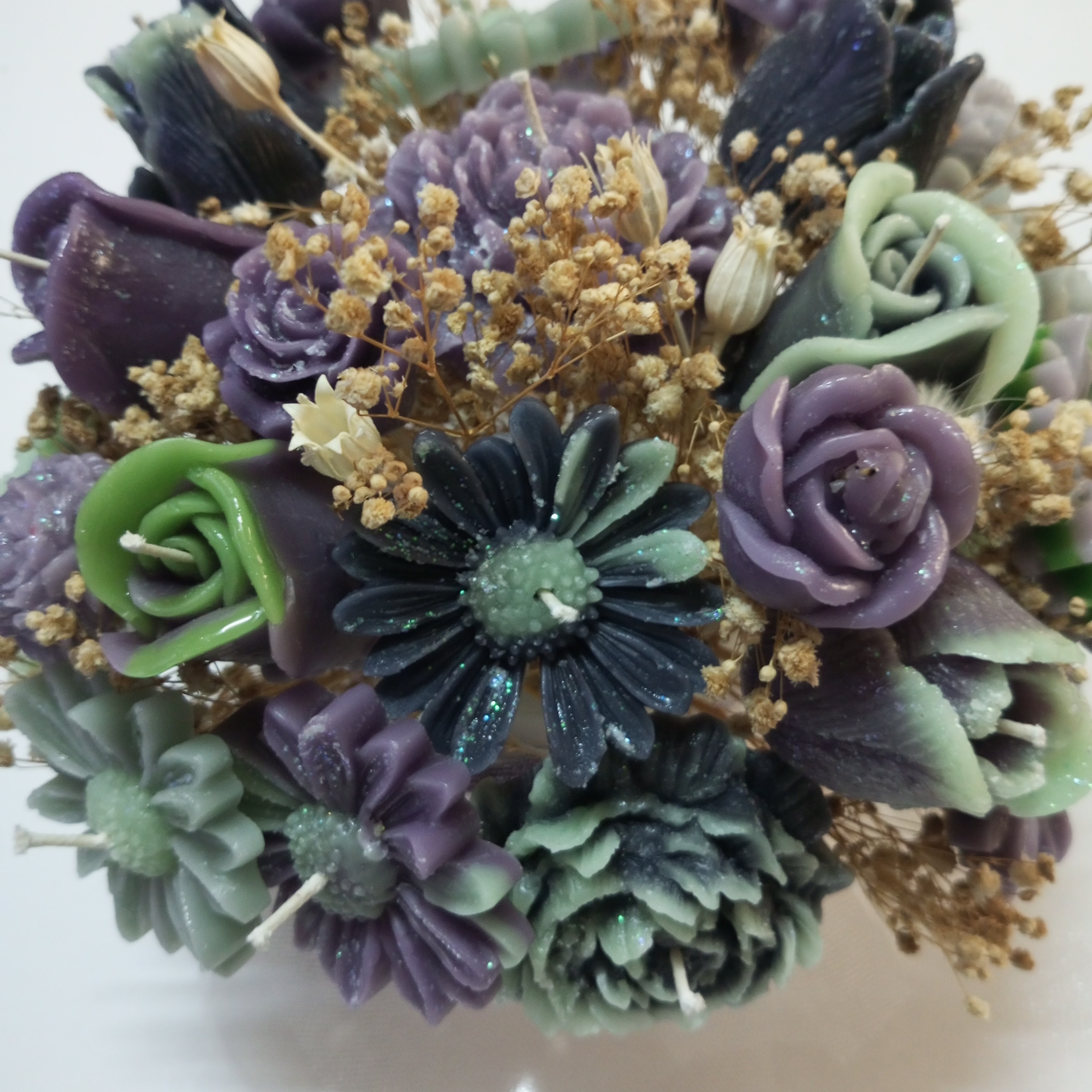 - Güller: Bukette yer alan gül mumlar, zarafeti ve aşkı simgeler. Yeşil tonları ile birbirini tamamlayan güller, her mevsim mutluluğunuzu artıracak.