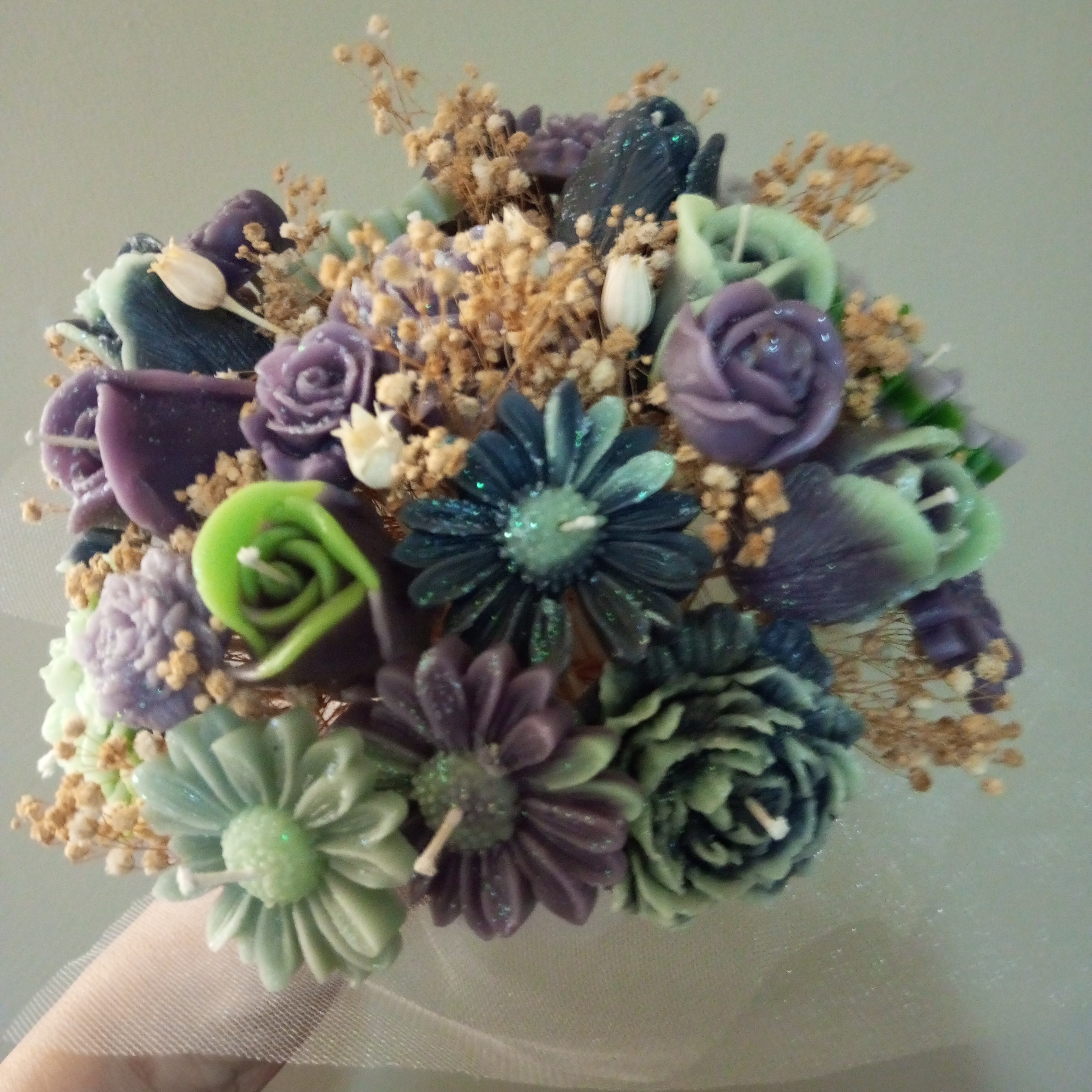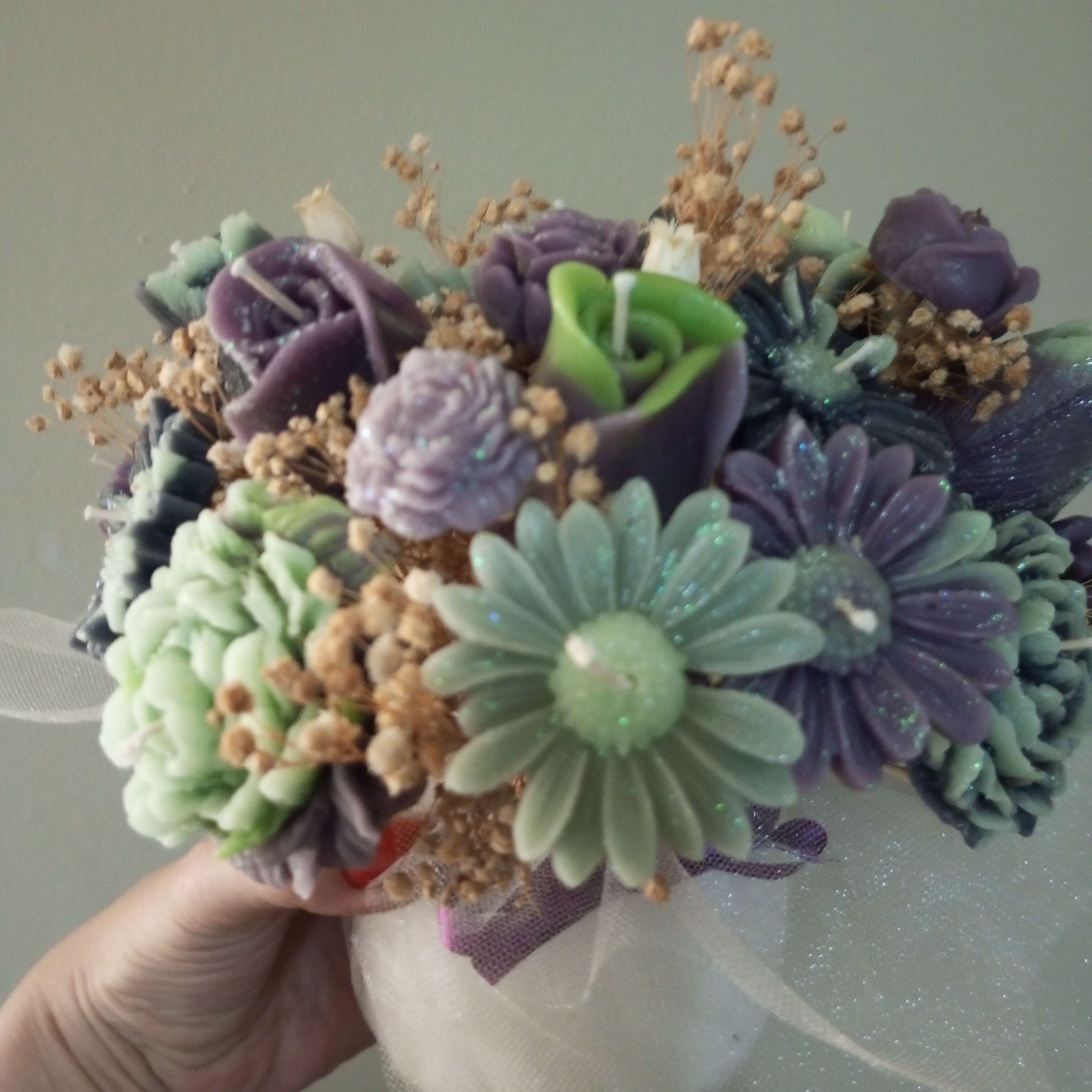 Mor-Yeşil Şakayık-Gül-Papatya Mum Çiçek Buketi