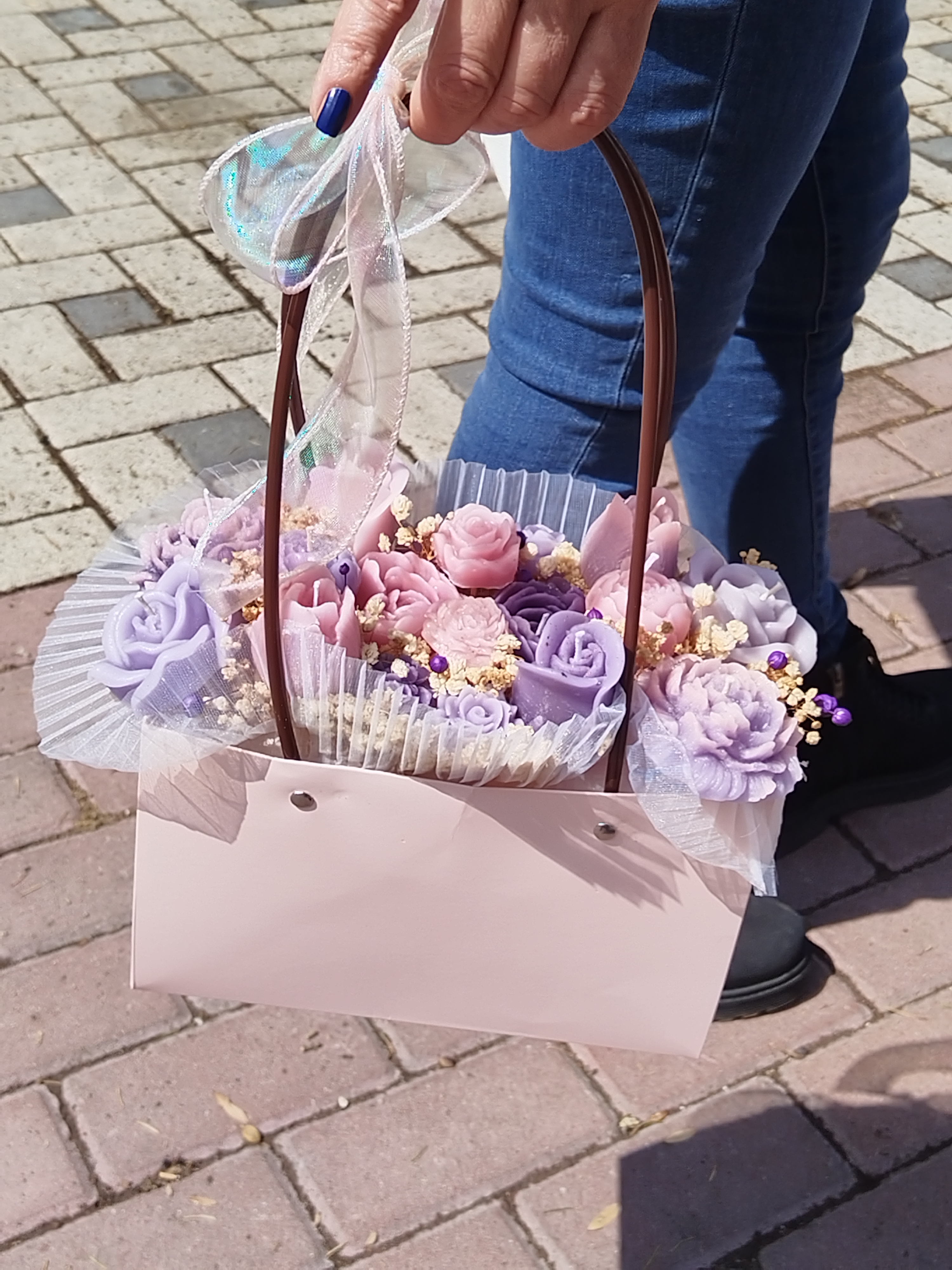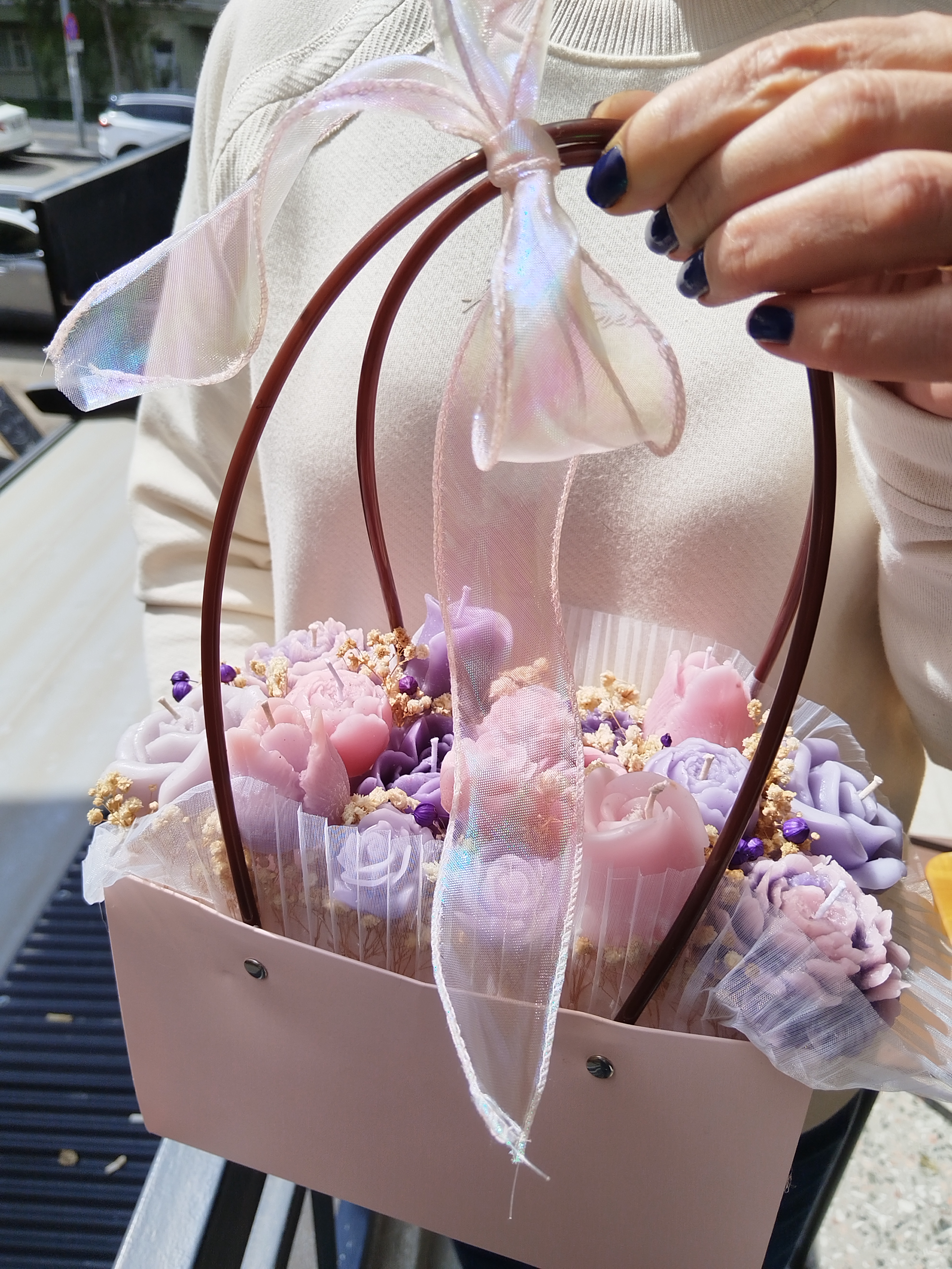 Pembe Çantalı Kolay Taşınabilir Pembe Mor Mum Hediyelik Buket