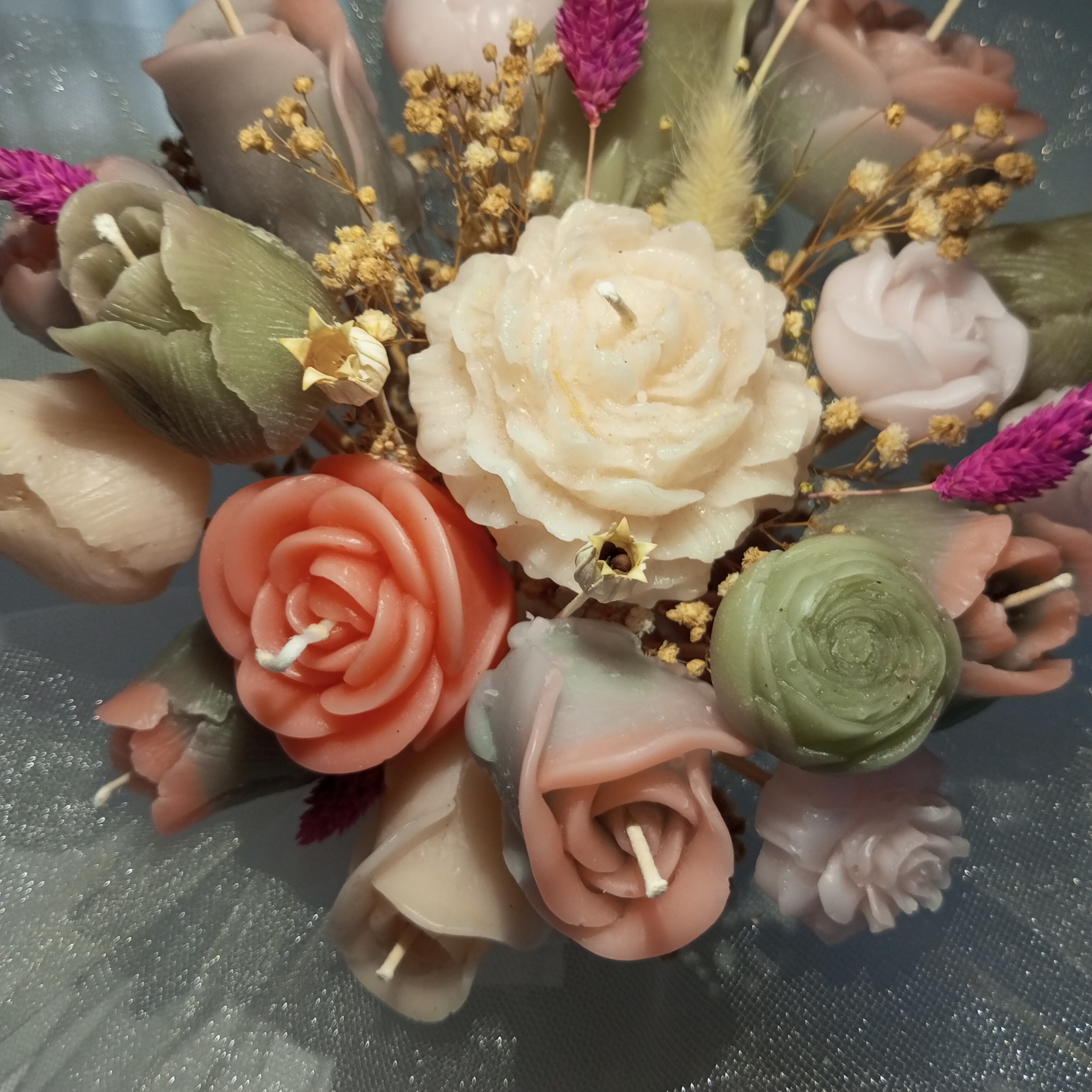 Bu muhteşem tasarım, pembe ve gri tonlarının uyumuyla zarif bir görünüm sunarken, her anı güzelleştirir. Buket, evinize veya ofisinize göz alıcı bir dokunuş katarken, aynı zamanda romantik bir atmosfer yaratır. Mumun yanmasıyla birlikte yaydığı yumuşak ışık, mekana sıcaklık ve huzur katar.