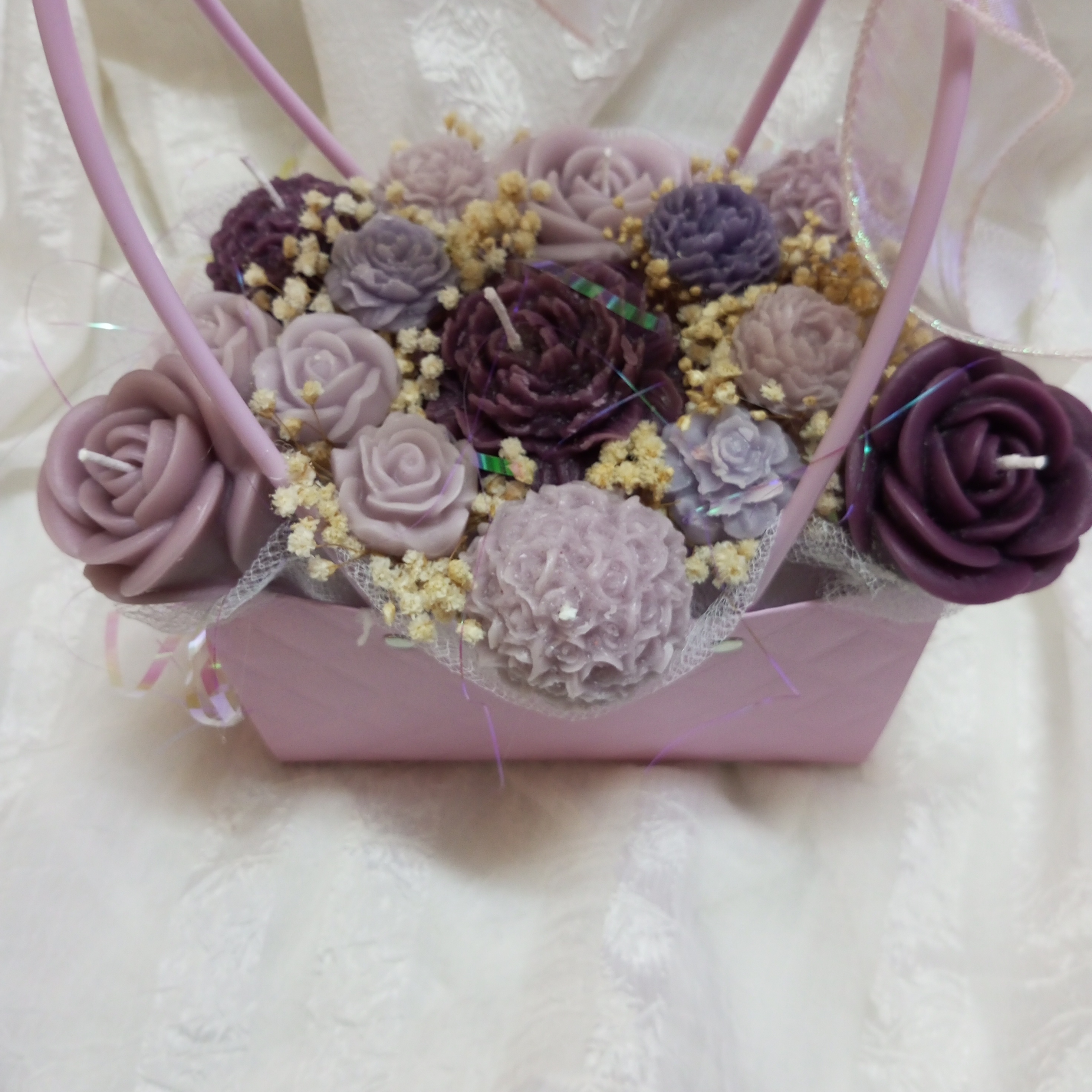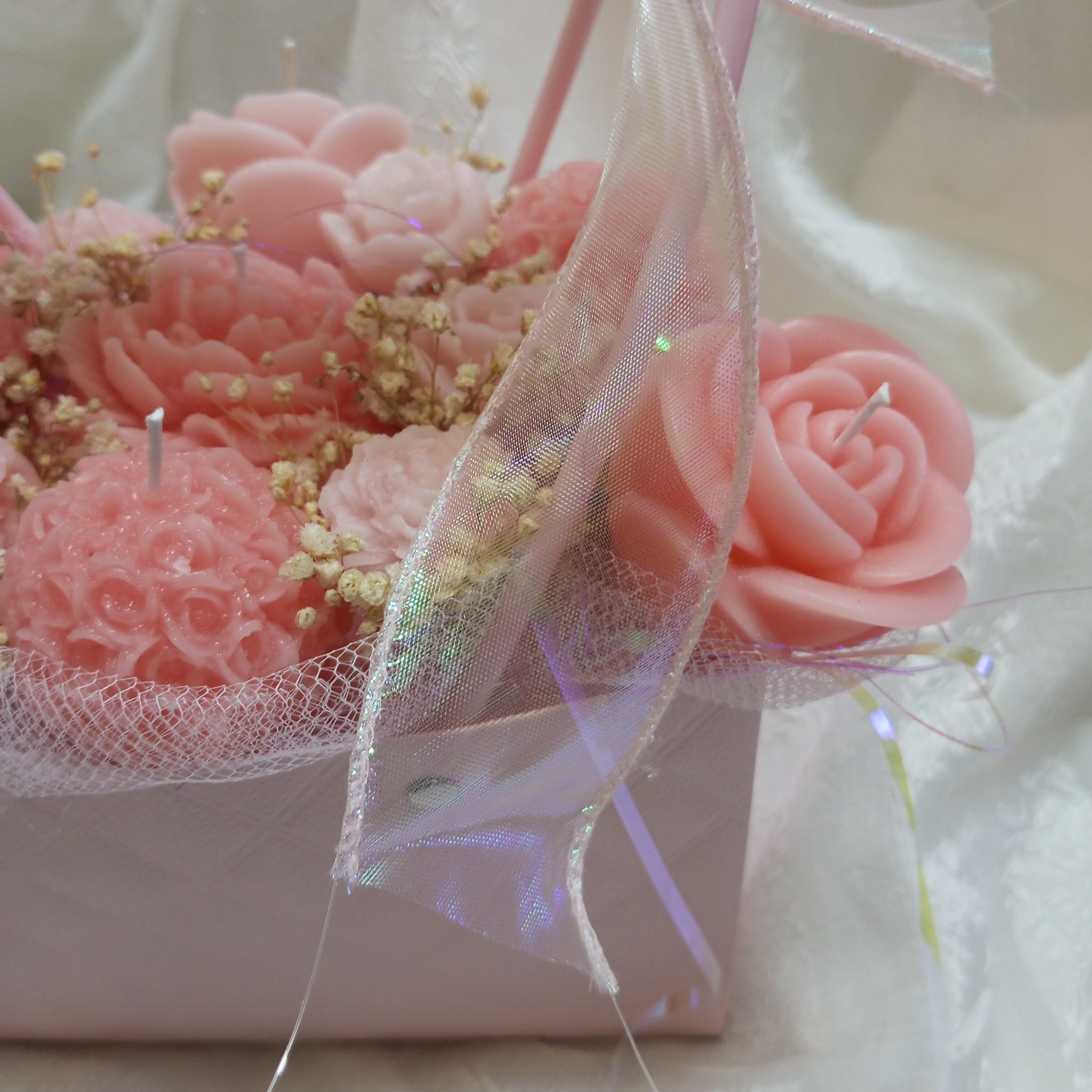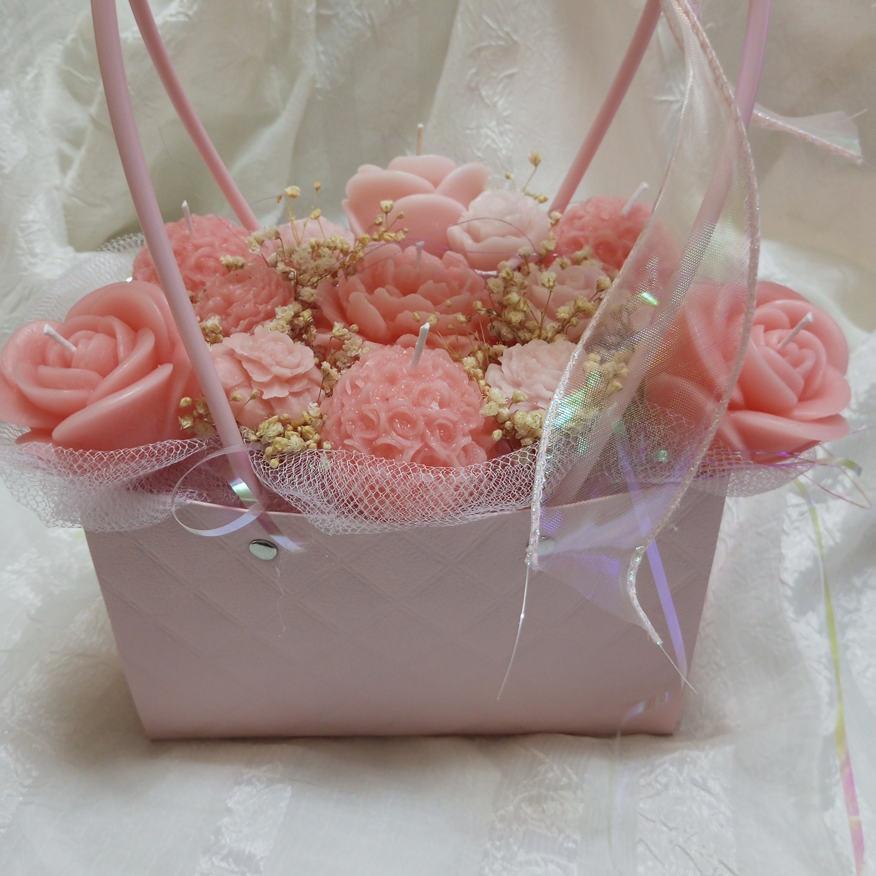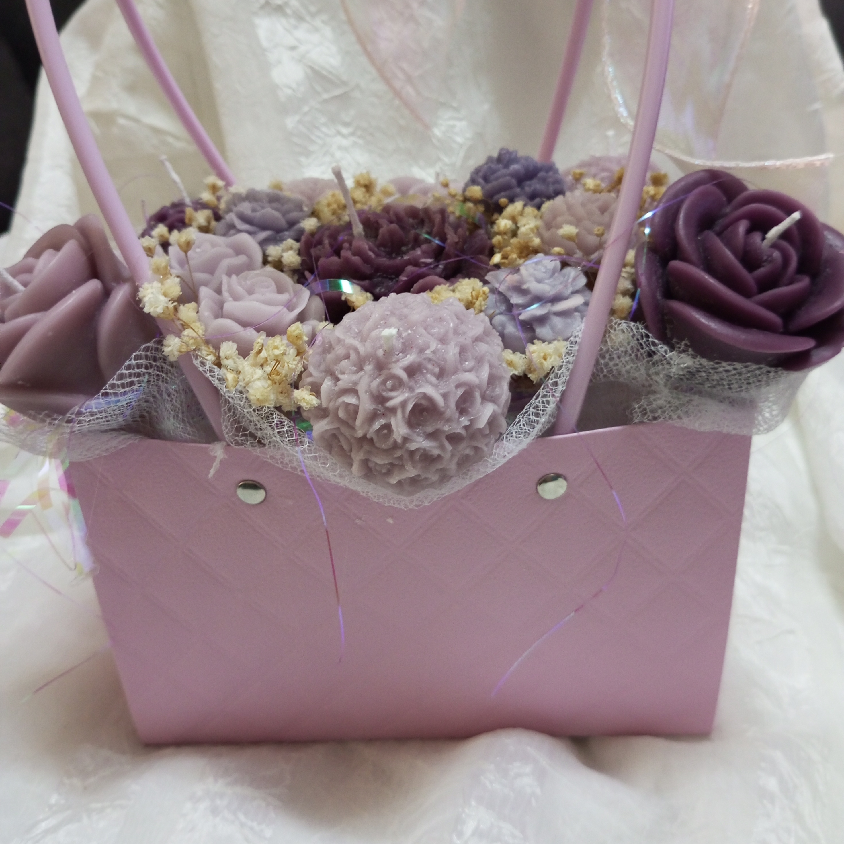 Yeşil -Pembe - Lila Renkli Çantalı Soft Renkli Gül-Top Kalp Mum Çiçek Hediyelik