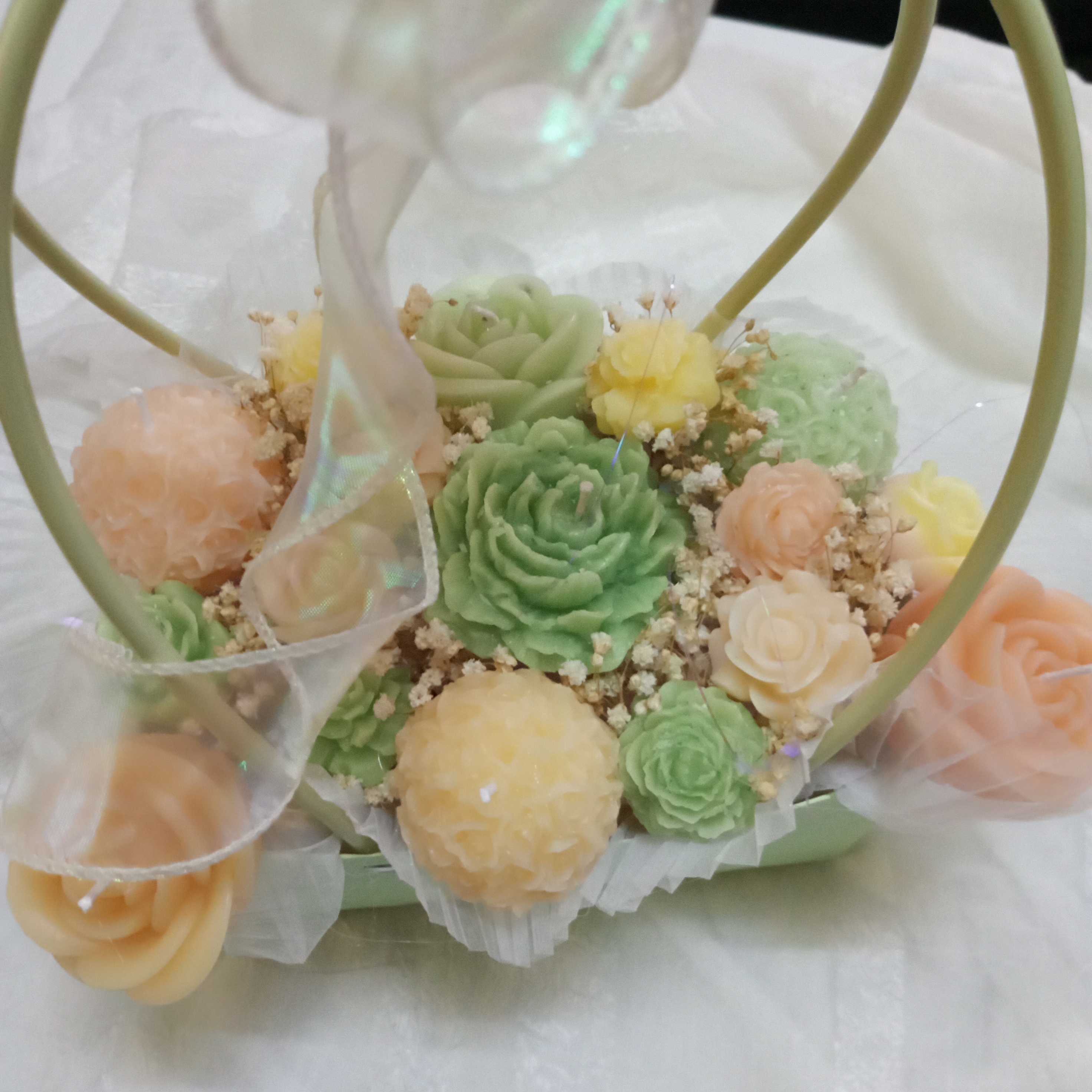 Yeşil çantalı soft renkli gül-top kalp mum çiçek, çeşitli özel günlerde hediye edilebilecek mükemmel bir üründür: